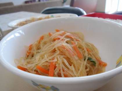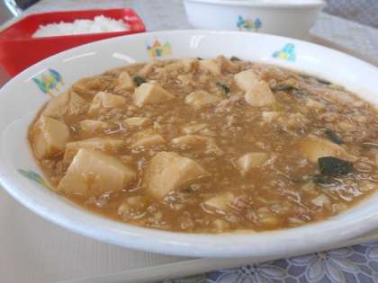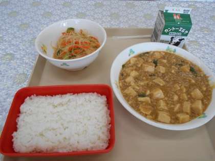 給食のメニューは, ごはん マーボー豆腐 春雨サラダ 牛乳 です。