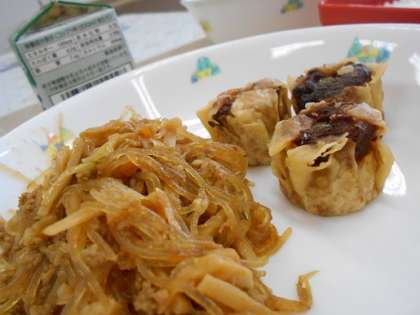 麦ごはん 揚げシュウマイ マーボー春雨 チンゲンサイのスープ 牛乳