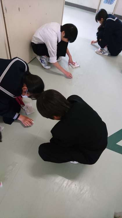 清掃時間です。黙々と床の汚れを落としています。みんなで使う学校を美しくし,気持ちよく過ごせますね。日々の地道な作業ですが,いらしたお客様への「おもてなし」にもつながるのではないでしょうか。