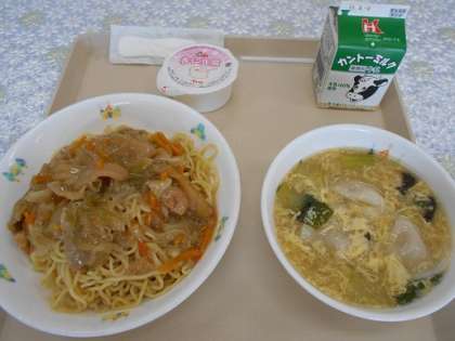 五目あんかけ焼きそば 餃子入り卵スープ 杏仁豆腐 牛乳
