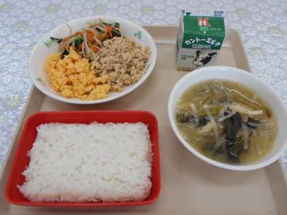 今日の給食 公開日 2019/07/05 更新日 2019/07/05 CS(学校運営協議会) ごはん 二色そぼろ(鶏そぼろ・炒り卵) おひたし 味噌汁 牛乳 鶏そぼろと炒り卵の甘みが口の中に広がり,とてもおいしかったです。 ごちそうさまでした!!