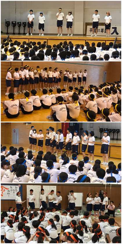 結団式 公開日 2019/07/05 更新日 2019/07/05 PTA 6時間目体育祭決断式が行われました。 自主、剛健、協力の3団に分かれ、今年の体育祭に向けて団代表から決意表明がありました。 その後、団ごとに分かれた練習では、行進や校歌などに一生懸命取り組む姿が印象的でした。