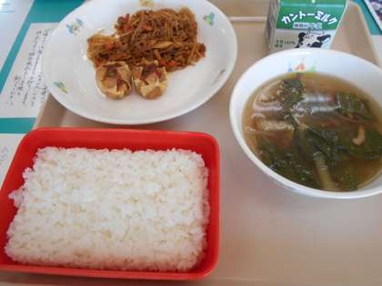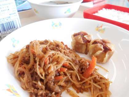 麻婆春雨は,豚肉やたけのこ,春雨がピリ辛でごはんが進みました。