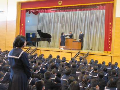 本日、取手市展及び県芸術祭の表彰が行われました。前回よりも大きな返事が聞こえてきました。第2学期終業式では、各学年の代表者が2学期の振り返りを全校生徒の前で発表しました。どの学年も学習や行事への取組みで成長した姿が伝わってくる内容でした。明日から冬休みとなります。健康で充実した有意義な時間となることを期待しています。