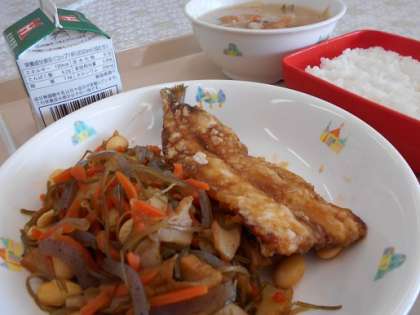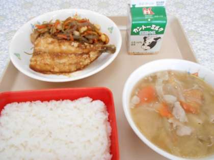 ごはん いわしのかば焼き 昆布と大豆の煮物 豚汁 牛乳