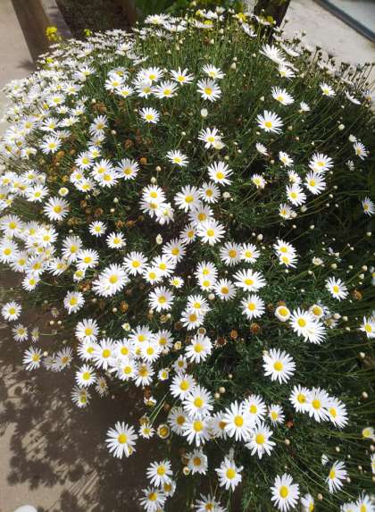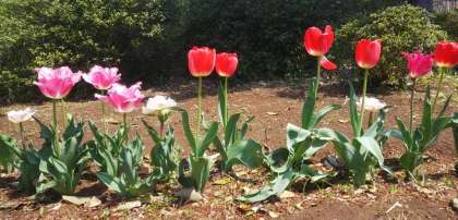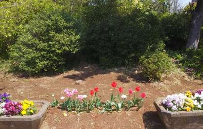 4月15日(水)校舎前の花壇にマーガレットが見事に咲いています。可愛らしいチューリップも咲きました。