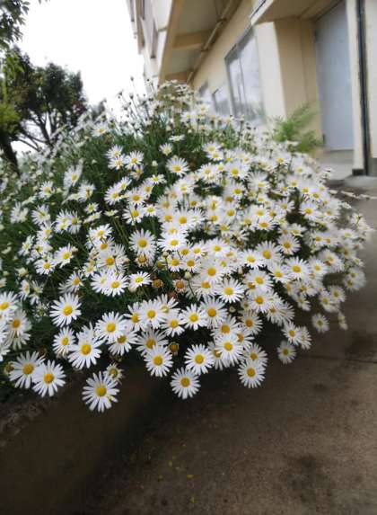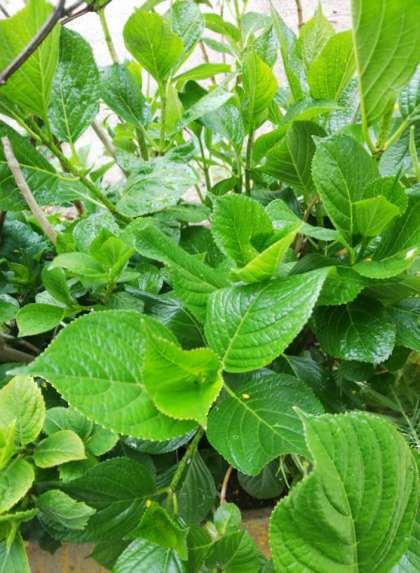 雨の中、今日もきれいに咲いています。 あじさいの葉も、みずみずしいです。