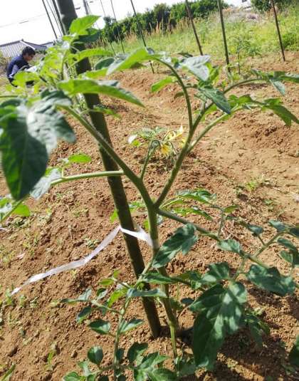 5月13日(水)真夏のような暑さ、畑の苗が生長しています。トマトの脇芽を取って、苗周辺の草を刈りました。