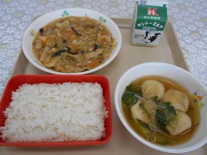 麦ごはん 八宝菜 餃子スープ 牛乳