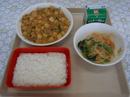 ごはん 麻婆豆腐 春雨サラダ 牛乳 エネルギー 865㎉ 塩分 2.5g ごちそうさまでした!!