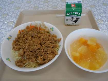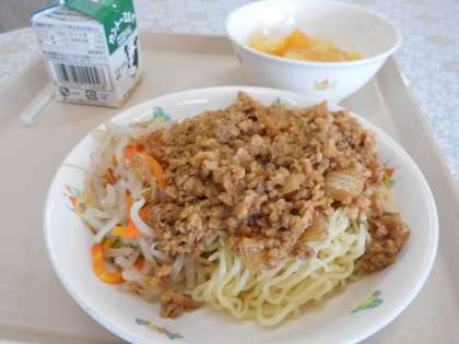 ジャージャー麺 添え野菜 フルーツのゼリー和え 牛乳
