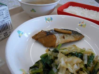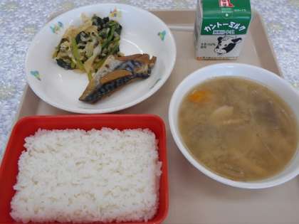 ごはん さばのカレー煮 おひたし みそけんちん汁 牛乳