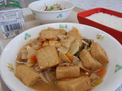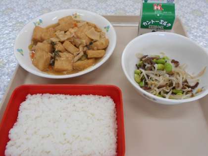 ごはん 生揚げの中華煮 もやしときくらげのサラダ 牛乳