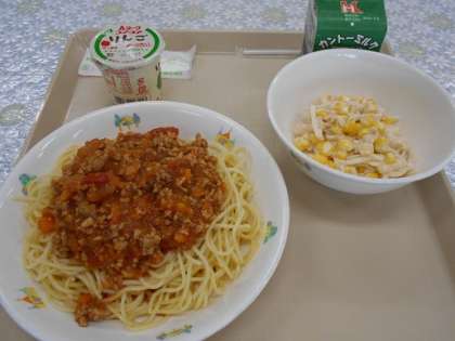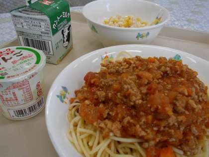 スパゲッティミートソース 公開日 2020/10/13 更新日 2020/10/13 CS(学校運営協議会) スパゲッティミートソース チキンサラダ ヨーグルト 牛乳 スパゲッティミートソースは,ソースはまろやか,パスタは モチモチでおいしかったです。 ごちそうさまでした!! エネルギー 886㎉ 塩分 2.0g