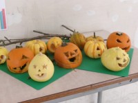 1年生の廊下には、手作りのハロウィンかぼちゃの置物が置かれています。この時期らし...