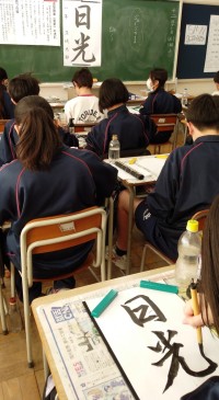 はじめて行書を書きました。書体の歴史を学習し、楷書と比較しながら行書の特徴を探りました。今回は、「点画の連続」を目標に 日光 を書きました。 書き慣れていないせいか、なかなか難しかったようですが...