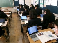 1時間目は各学級、道徳の授業でした。タブレット端末を活用し、生徒たちが考えや思いを入力し、交流するような場面が見られました。生徒たちが題材について、一生懸命に考えている表情が印象的でした。