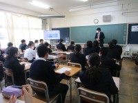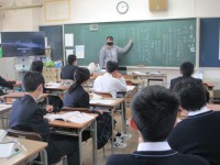 『助詞』にはどんな種類があるのかということを学習しました。教師の発問に対して、生徒たちが考え、答えるという流れの中に、生徒たちが一生懸命に学習しようという雰囲気が感じられました。また、生徒たちがつぶや...