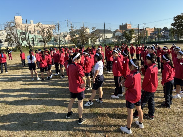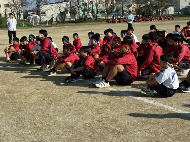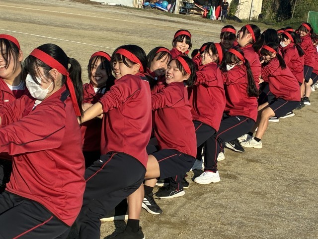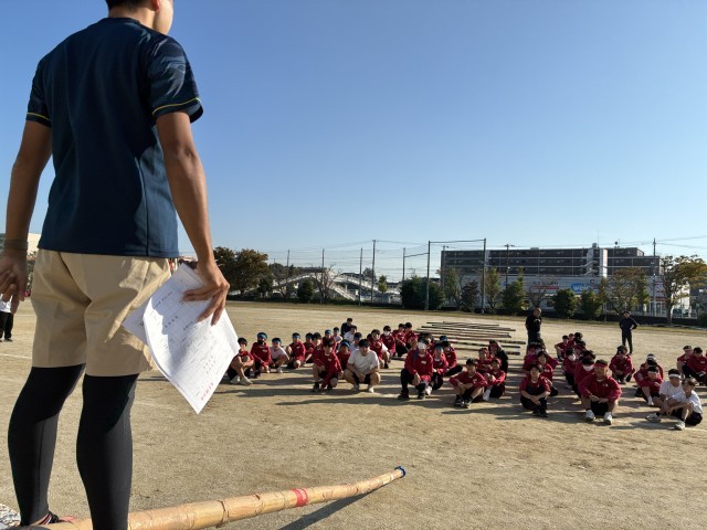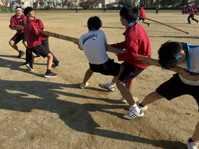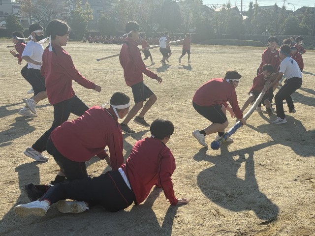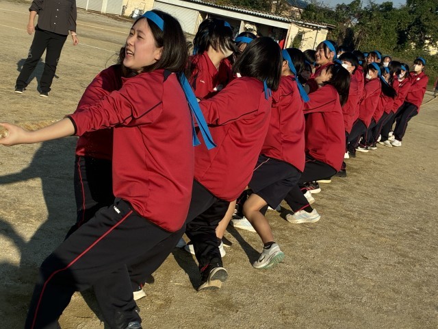 全学年男子による棒引き、全学年女子による綱引きの練習です。並び方や移動の仕方を確認した後は、練習にもかかわらず真剣勝負です。本番の結果はいかに…