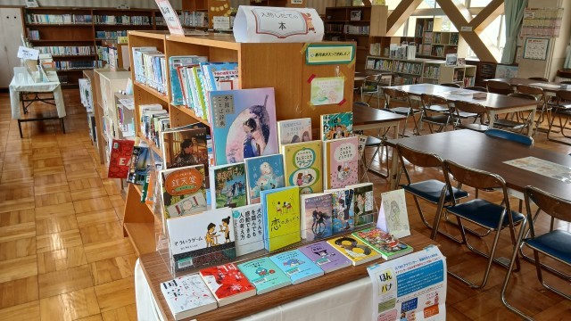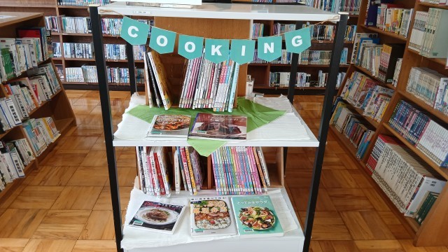 図書室にはいったら、新しい本の他にも、部活メシやスイーツなどの美味しそうな本のコーナーもありました。