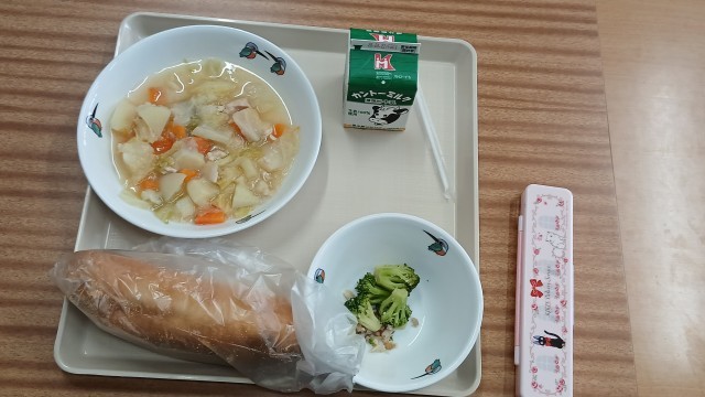 今日の給食は、きなこ揚げパン、ポトフ、ブロッコリーのガーリックソテー、牛乳、です。