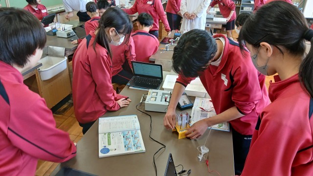 2年生では、水の電気分解を学びました。今日は、その学びを活かしながら、塩酸を電気分解したときに発生する物質と、その物質が発生したことをどのように検証するのかを考え、実験しています。