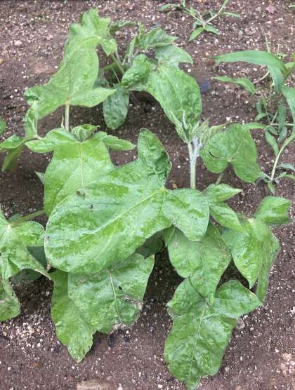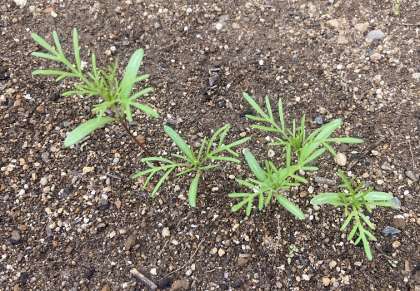 北棟,1年生昇降口手前の花壇ではコスモスが芽を出しています。