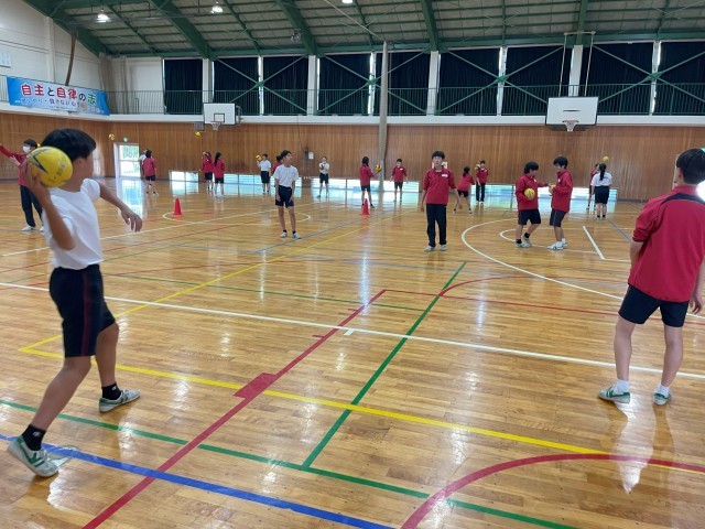 本日4校時、3年2組は体育館でハンドボール投げを行いました。