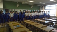 移動教室から戻って、すぐに掃除できるように机が移動されています。