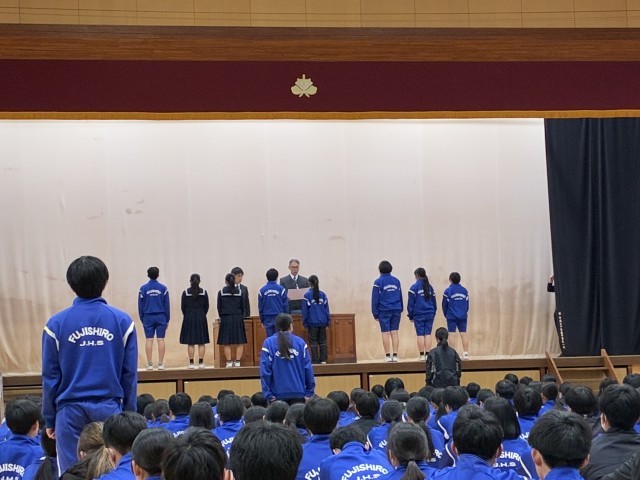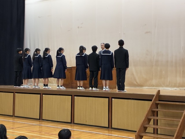 5時間目の集会では、表彰式や、生徒会役員の認証式が行われました。たくさんの表彰がありました。