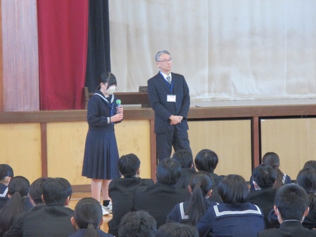 学級委員が全校生徒の前で、しっかり振り返りを行いました。