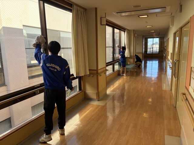 1年生ボランティア活動 公開日 2026/03/12 更新日 2026/03/12 1年生 今年度最後のボランティア活動です。隣りのなごみの郷で10名の生徒が窓拭きの手伝いをしました。施設の皆さんに感謝され、嬉しいひとときこれからも地域貢献に取り組んでまいります。