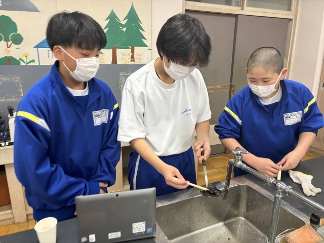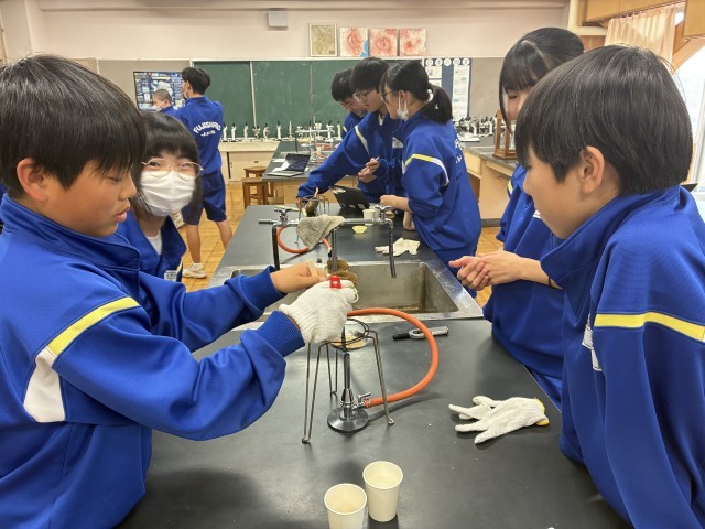 1年生の理科でカルメ焼きの実験を行いました。うまく膨らまないなど苦戦しているグループが多かったですが、協力して楽しそうに活動していました。