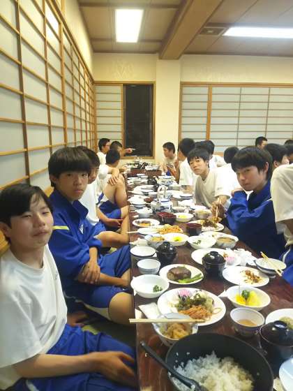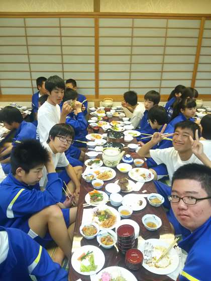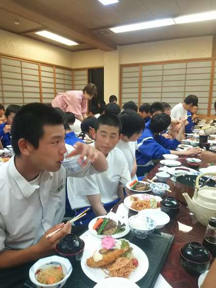 夕食は大広間で 公開日 2016/05/22 更新日 2016/05/22 3年生 疲れを知らないみなさん、すごい食欲です!たくさん食べて、明日も元気に過ごしましょう。 野球の選手も到着し、全員そろいました。