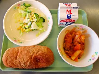 3月17日(金)の給食 公開日 2017/03/17 更新日 2017/03/17 学校行事 今日の給食の献立は あげパン(きなこ) チキンとペンネのトマト煮 コーンサラダ(ドレッシング) です。 カロリーは,816㎉です。