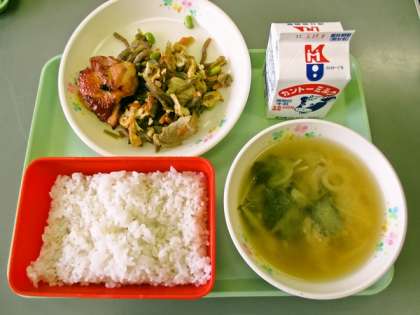 3月21日(火)の給食 公開日 2017/03/21 更新日 2017/03/21 学校行事 今日の給食の献立は 麦ごはん 牛乳 鶏肉の香味焼 茎わかめの炒め煮 こまつなの味噌汁 です。 カロリーは,836㎉です。