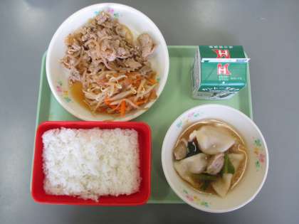 4月20日(木)の給食 公開日 2017/04/20 更新日 2017/04/20 学校行事 今日の給食の献立は ごはん 牛乳 豚肉と白滝のピリ辛炒め 華風和え スープ餃子 です。 カロリーは,877㎉です。