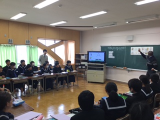 1年生の英語の授業では,ALTを含めて3人の指導者でアルファベットの学習に取り組んでいました。