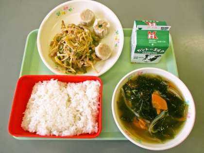 ごはん 牛乳 シュウマイ チンジャオロース わかめスープ です。