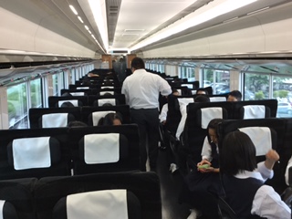 見送りを受けての出発です。元気に行ってきます。 常磐線は,修学旅行専用列車で快適です。