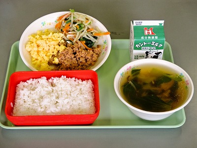 5月16日(火)の給食 公開日 2017/05/16 更新日 2017/05/16 学校行事 今日の給食の献立は 麦ごはん ビビンバ(肉味噌) ビビンバ(炒り卵) ビビンバ(ナムル) かにかまスープ です。 カロリーは,783㎉です。