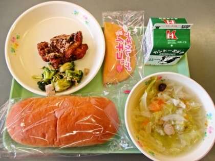 ミルクパン 牛乳 鶏肉のからあげ ブロッコリーのガーリックソテー キャベツのスープ デザート です。
