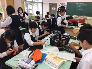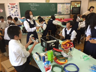 今日の授業の一コマ(3年) 公開日 2017/05/22 更新日 2017/05/22 学校行事 3年生は,7月に久賀保育所で幼児触れ合い体験が計画されています。その際に使用する「幼児が喜ぶおもちゃ」づくりに取り組んでいます。 どんなおもちゃができるのでしょう?
