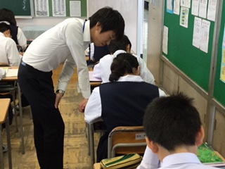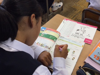 英語の基本文の確認をしています。 2人の指導者で対応しています。