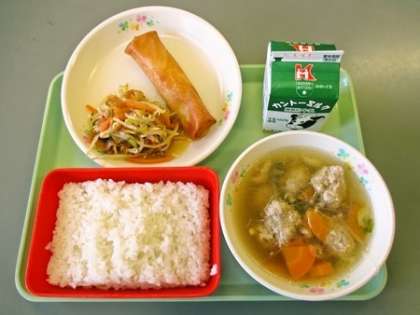 ごはん 牛乳 春巻き 華風和え 肉団子スープ です。