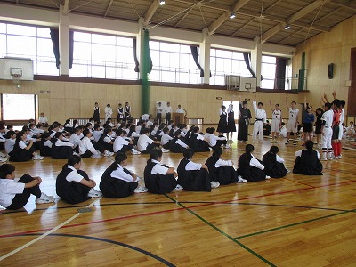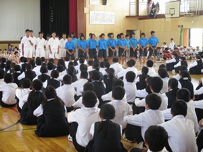 6月5日5校時に壮行会が行われ,2,3年生は総体への意気込みを元気に発表しました。1年生はそれを真剣に聞いていました。1年生の中にも選手として総体に参加する生徒もいます。試合では,チーム一丸となって頑張ってくれることと思います。