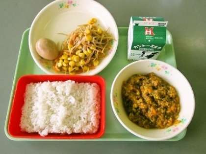 6月6日(火)の給食 公開日 2017/06/06 更新日 2017/06/06 学校行事 今日の給食の献立は 麦ごはん 牛乳 ドライカレー 煮卵 ごぼうサラダ(ドレッシング) です。 カロリーは,841㎉です。