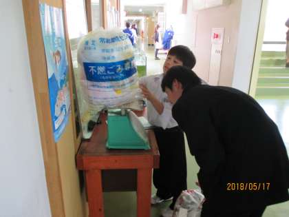 給食後の昼休み,給食委員が後片付けをしています。ごみを捨てるのも,その仕事のうちの一つです。