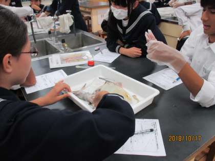 2年生 理科の学習の様子 公開日 2018/10/17 更新日 2018/10/17 2年生 2年生の理科では,イカを解剖して観察する活動を通して,イカの体のつくりを学習していました。生徒達は,興味津々の様子で観察していました。
