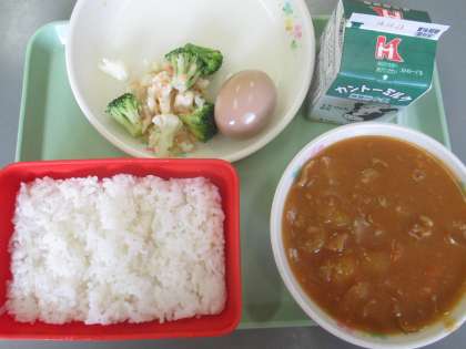 ごはん ポークカレー 煮卵 花野菜サラダ(ドレッシング)です。